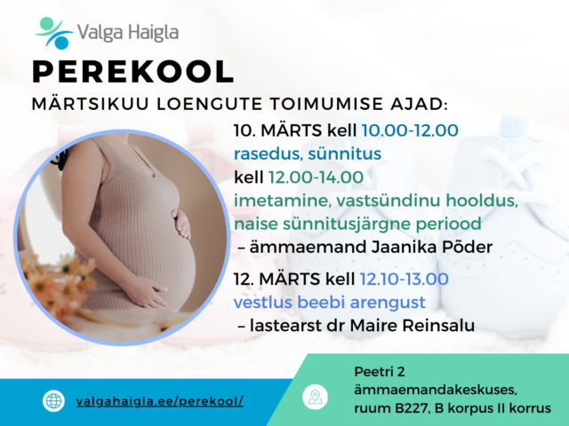 Perekooli loengud märtsis toimuvad 10. ja 12. kuupäeval. Oodatud on lapseootel naised üksinda...