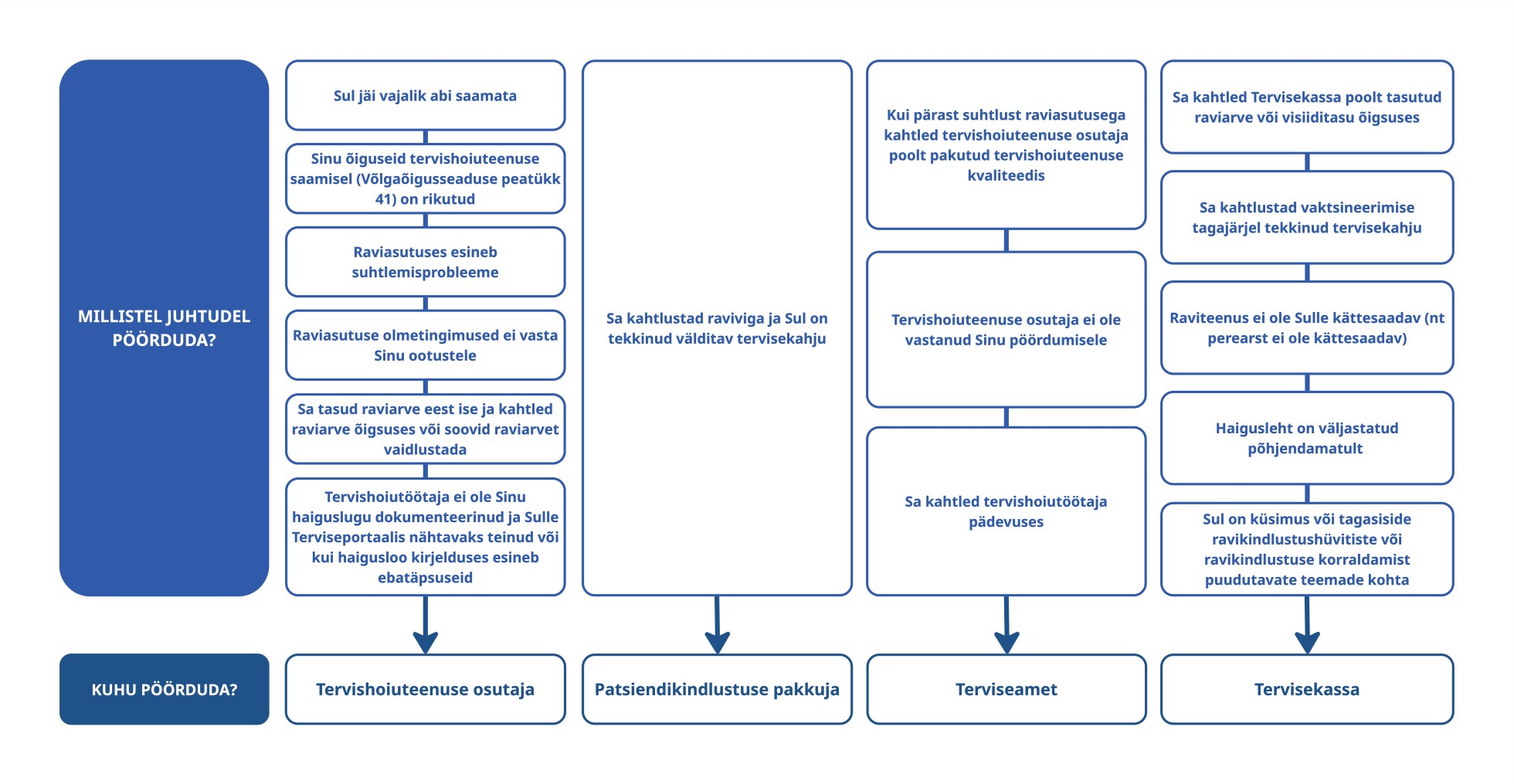 Näiteks kui on probleeme ravikvaliteedi või tervishoiutöötajate pädevusega, saab pöörduda Terviseametisse. Seevastu ravivea tõttu tekkinud tervisekahju korral tuleb ühendust võtta kindlustusseltsiga, kellega sinu raviasutus on sõlminud kohustusliku vastutuskindlustuse lepingu. Kui aga mõni raviteenus pole kättesaadav või inimene näeb terviseportaalis oma raviarveid vaadates, et tasulise visiidi eest on tervishoiuteenuse osutaja arve esitanud ka Tervisekassale, tuleks pöörduda Tervisekassa poole.
