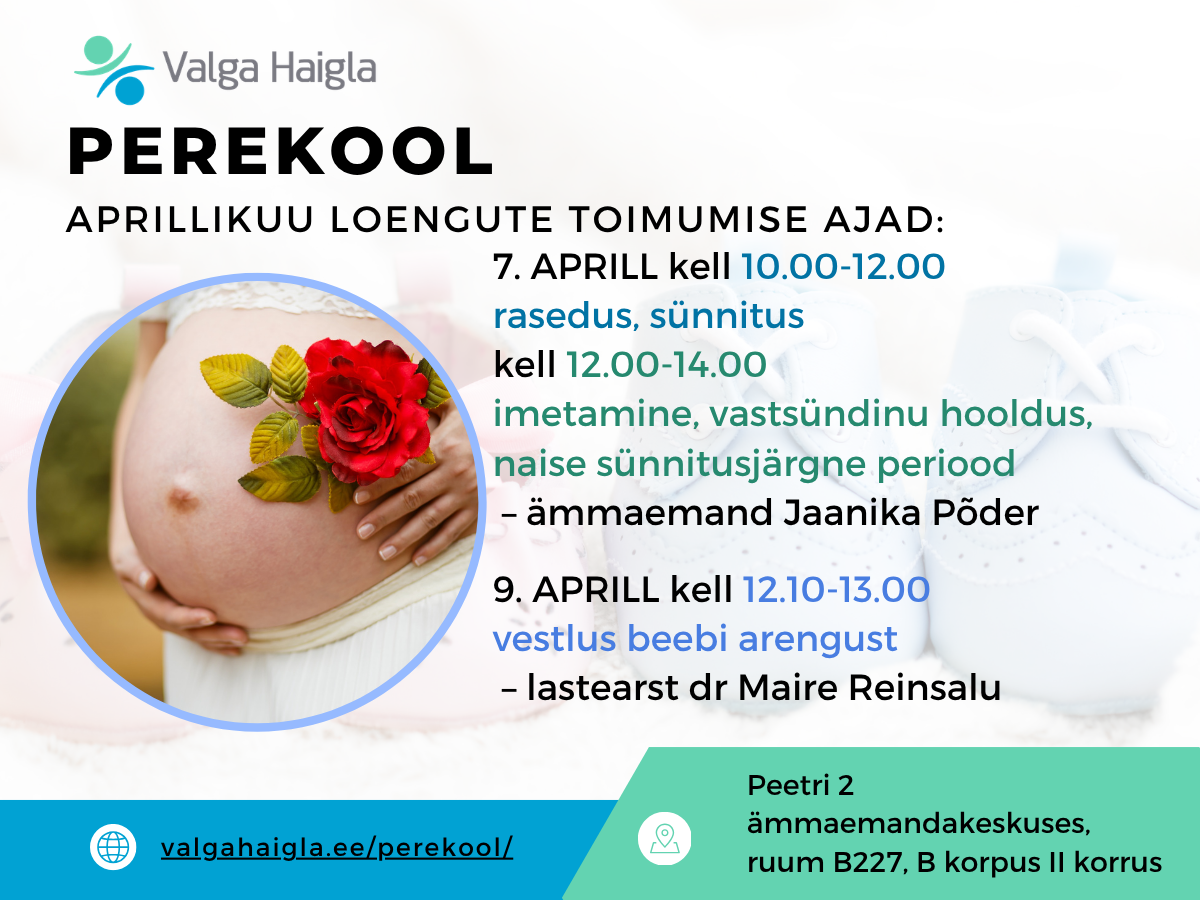 Perekooli loengud toimuvad 7. ja 9. aprillil. Oodatud on lapseootel naised üksinda või koos kaaslasega, emad ja isad koos lastega vanuses 0–18 elukuud. Kohale palume tulla ainult siis, kui olete täiesti terve.